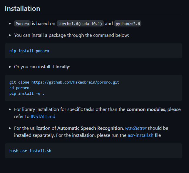 그래서 설치해보려고 했다. 주소는 (github.com/kakaobrain/pororo)